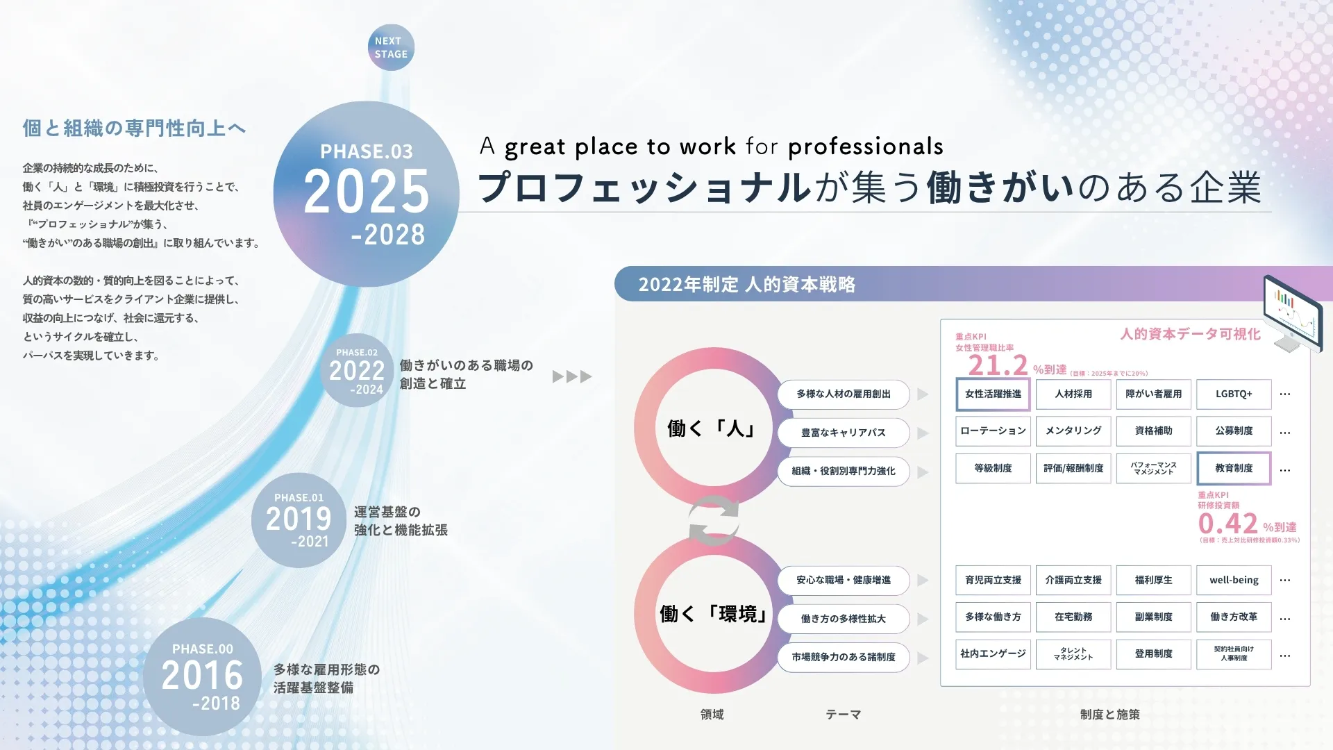 最重要課題の一つとして「人材のパフォーマンス向上(質・量)」を掲げており、売上対比研修投資額をKPIとし、2025年まで0.33%以上の積極投資を推進。33職種×役職ごとに必要な知識を学習できる約100コンテンツを提供し、自律的なキャリア形成を促す「キャリアマップ制度」を提供。0.42%の投資実行。