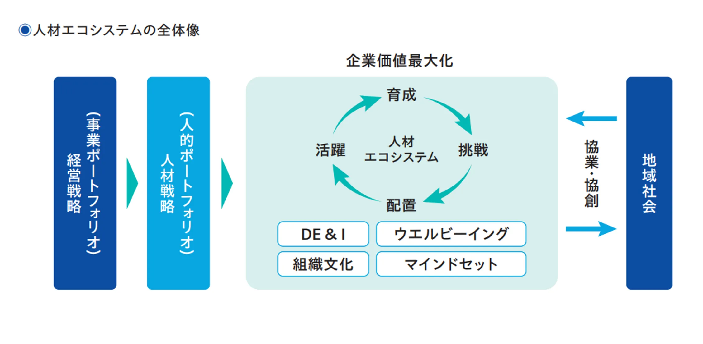 経営戦略に連動した人材フレームとして、採用から育成、挑戦と配置による活躍、地域に新たな価値を創出するための輩出までの「人材エコシステム」を構築している。既存事業の深化と新規事業の進化を両立する「両利きの経営」を実現するため、人的ポートフォリオと人材エコシステムによる人材の成長に注力している。