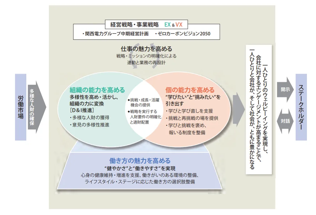 組織の能力・個の能力・働き方の魅力・仕事の魅力の4つの”高める”を柱に、挑戦・成長意欲を引き出し、多様な価値観を組織力に変える施策や、健やかで働きやすい環境の整備を実施している。さらに、人財戦略と事業戦略を連動させ、個人のミッションを明示することで、真に価値ある仕事に注力できる環境を整えている。