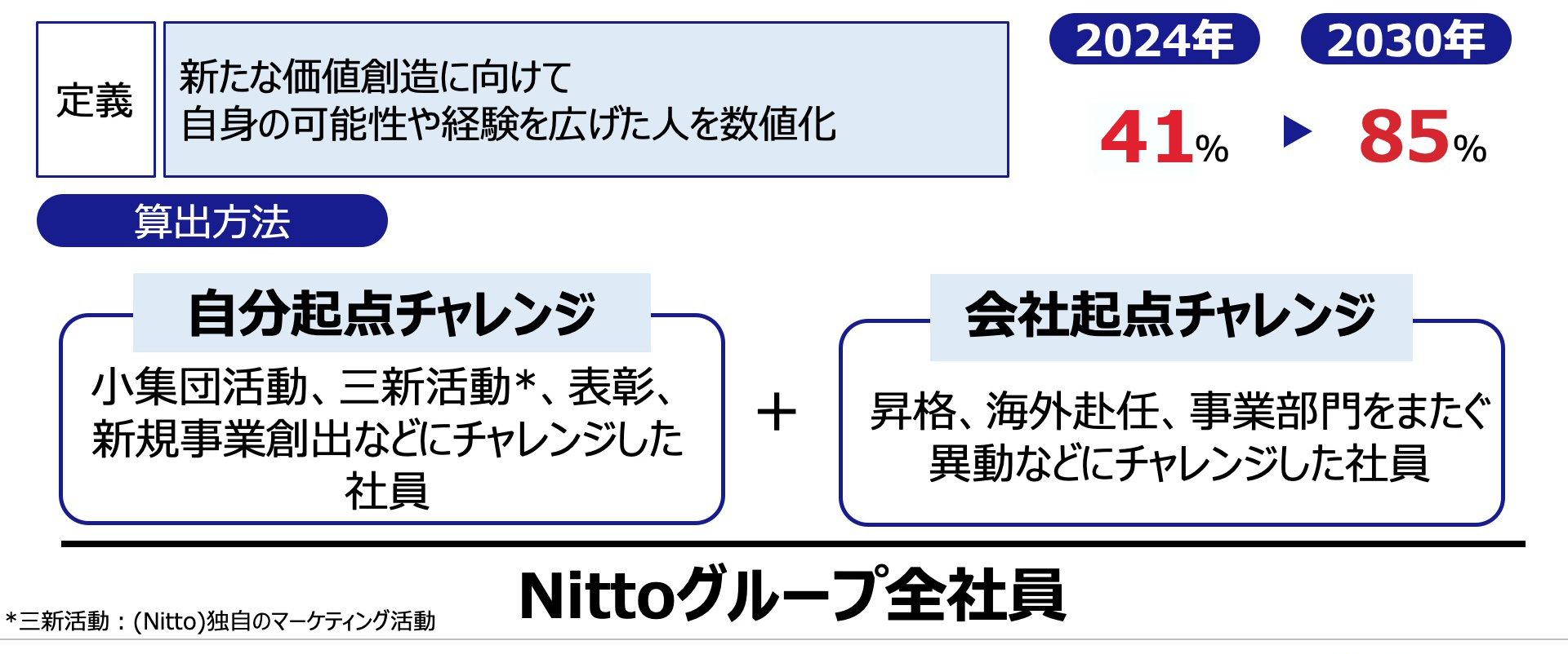 新たな価値創造に向けて自身の経験や可能性を拡げた社員を数値化する独自指標「チャレンジ比率」を設け ている。小集団活動や新規事業創出などにチャレンジした社員と、海外赴任や事業部門をまたぐ異動などに チャレンジした社員の合計比率85%を目指し、キャリアの可能性を広げ、個人と会社の成長につなげていく。