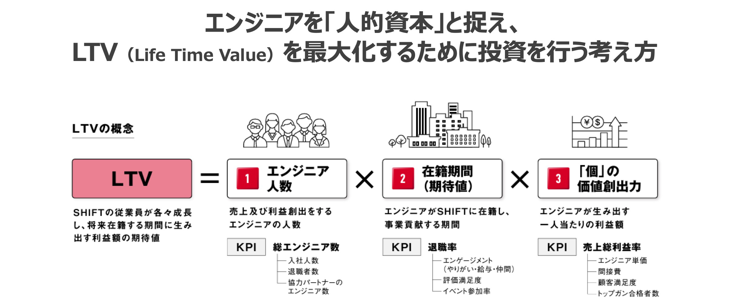 エンジニアを「人的資本」として捉え、LTV(Life Time Value)の最大化を目指し投資している。LTVは売上総利益額×在籍期間(期待値)×エンジニア人数で計算される。これにより、投資と事業がストレートにつながり、採用の最大化と退職の抑制、従業員のやる気向上とスキル向上に向けた取り組みの重要性を示すことができた